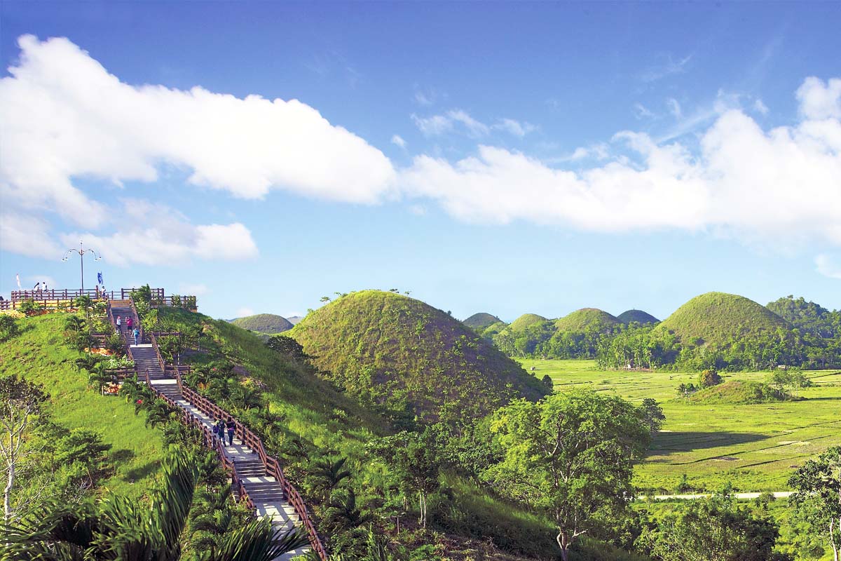 【巧克力山】:是由 1268 個大小山丘所組成的,每一座高度為40~120公尺,都是圓錐體,地質屬石灰岩地型,從登高處望下,會因時節不同而多有變化,時而翠綠,時而火紅,又時而昏暗,會讓您嘆為觀止,目前為世界十大奇景之一,您亦可挑戰一下自己的體能,登上數百個階梯的【比異雙飛觀景坪】,由高處俯瞰整個巧克力山的美景,更讓您有心曠神怡的舒適感。