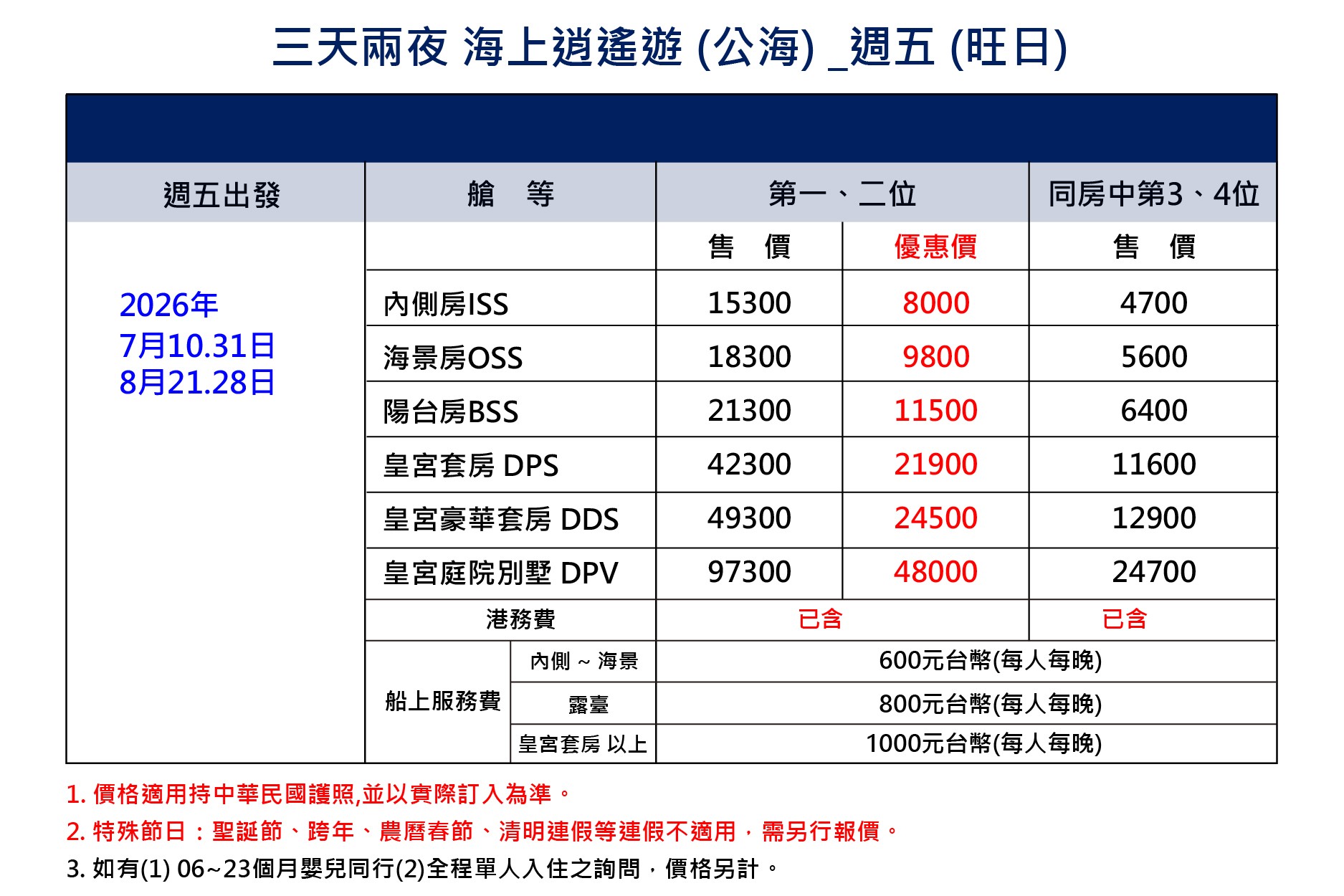 5、郵輪服務費 (每人每晚台幣計)。費用於船上支付。