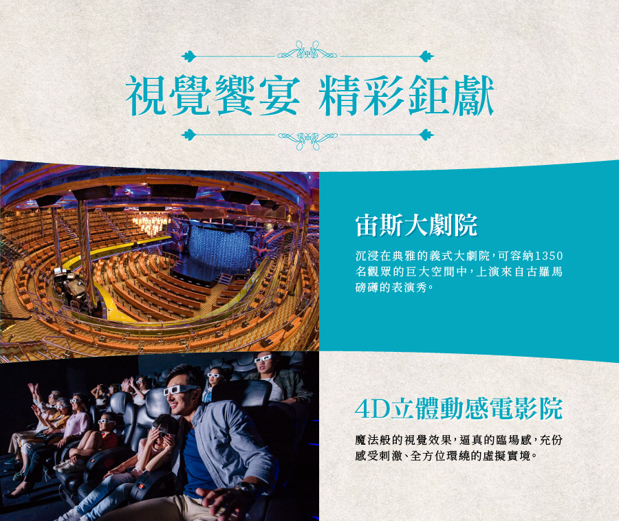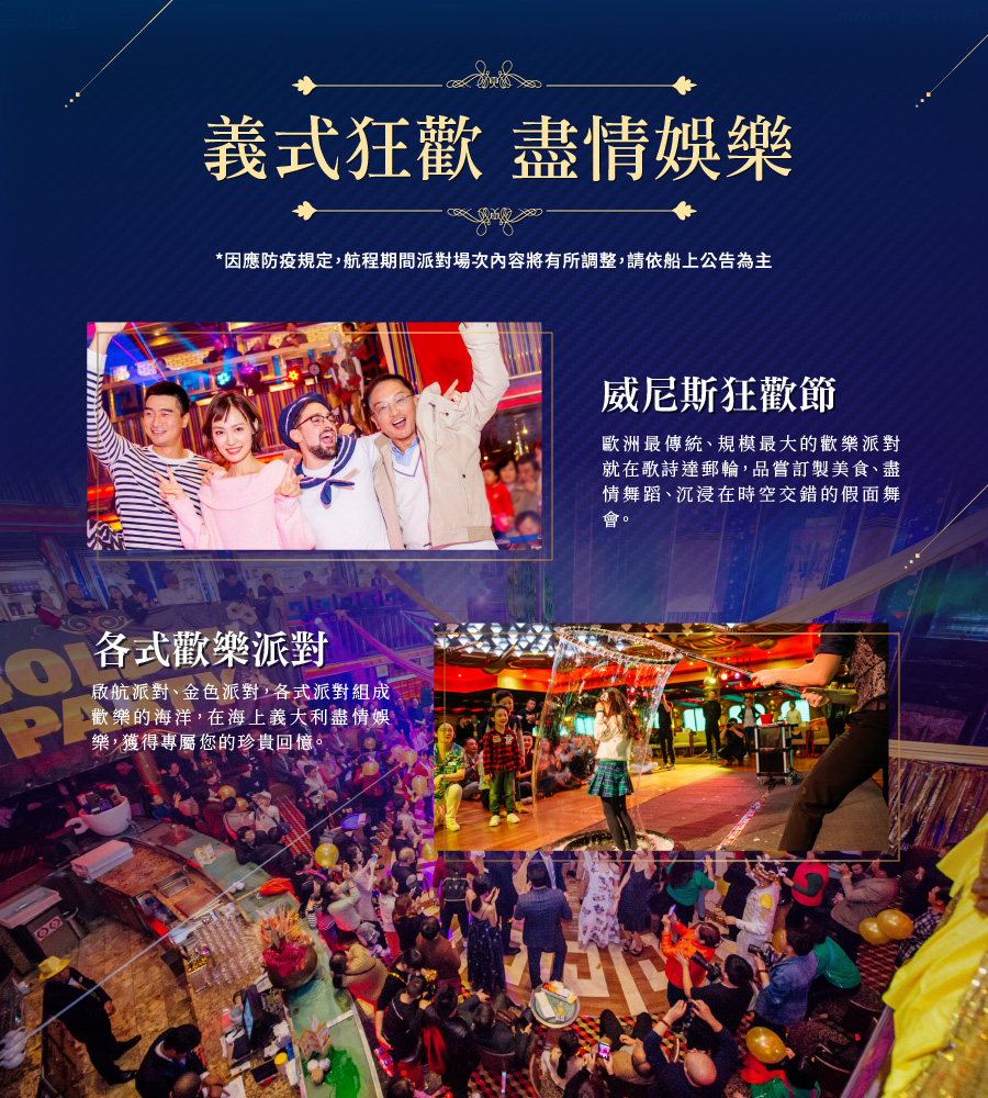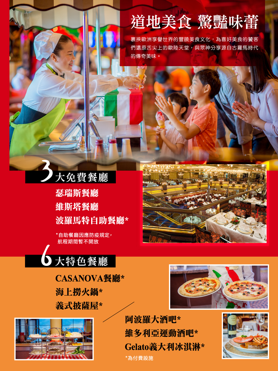 早餐:郵輪精緻美食 午餐:郵輪精緻美食 晚餐:郵輪精緻美食