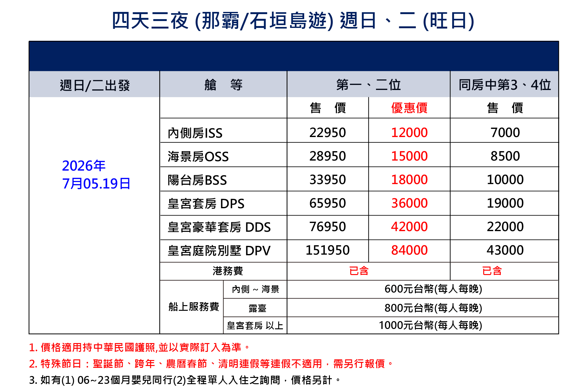 5、郵輪服務費 (每人每晚港幣計)。費用於船上支付。