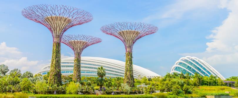 濱海灣花園是新加坡代表性景點,融合自然與前衛設計,園內栽種數十萬株植物,展現熱帶與高山植物的多樣風貌。超級樹群宛如未來森林,高達50公尺,樹身覆蓋著各式蕨類與攀爬植物,色彩繽紛,極具視覺震撼。