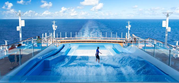 位於船尾的FlowRider海上衝浪天堂,如同海上的極限浪潮樂園。湛藍海景為背景,浪花翻湧中旅客挑戰乘風破浪的快感,感受速度與平衡的極致對決。無論新手或高手,都能在此盡情享受衝浪的激情與自由。